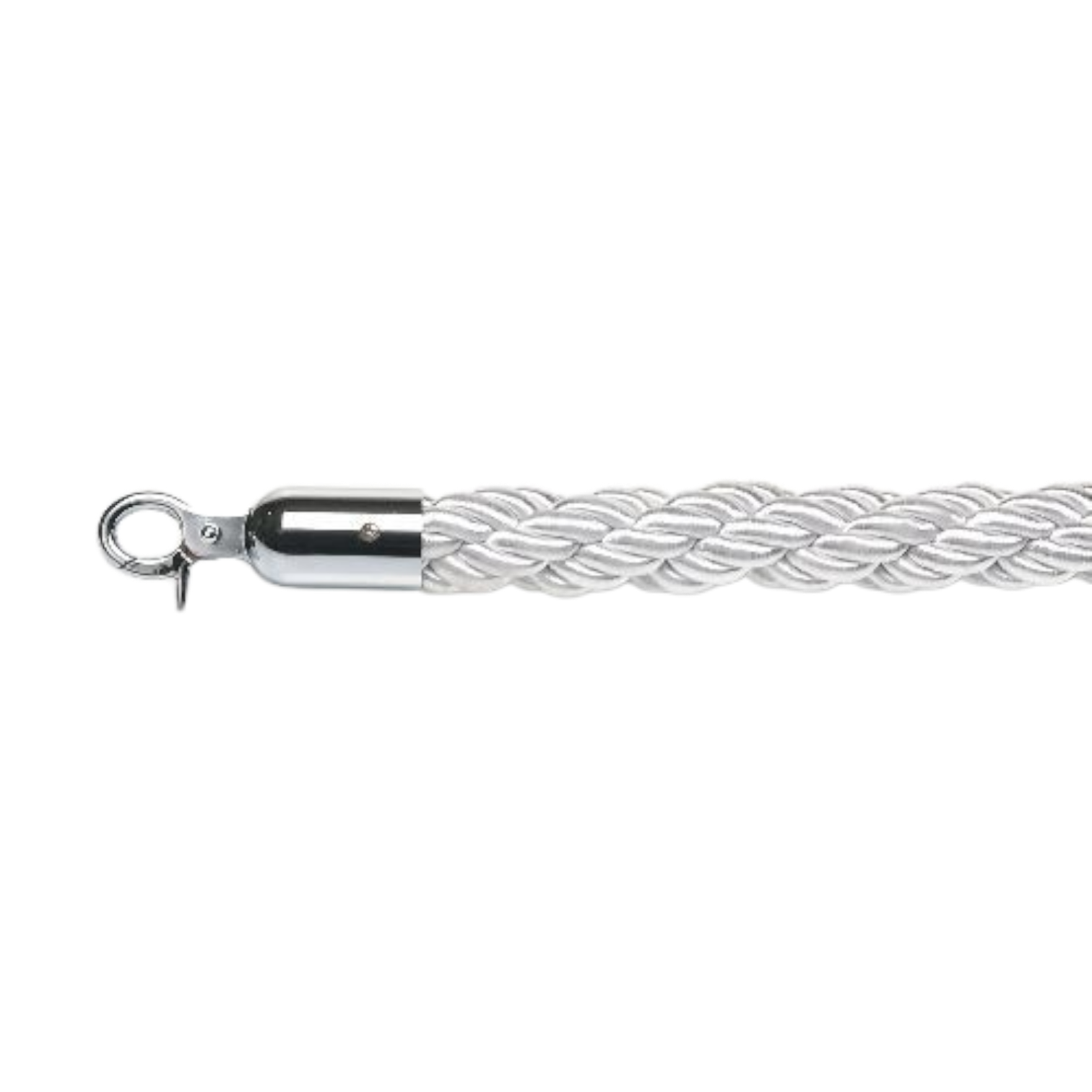 Edle geflochtene weisse Verbindungskordel passend zu unseren Kordelpfosten. Edelstahl-Beschlag mit Karabinerhaken-System. Länge 1.50m