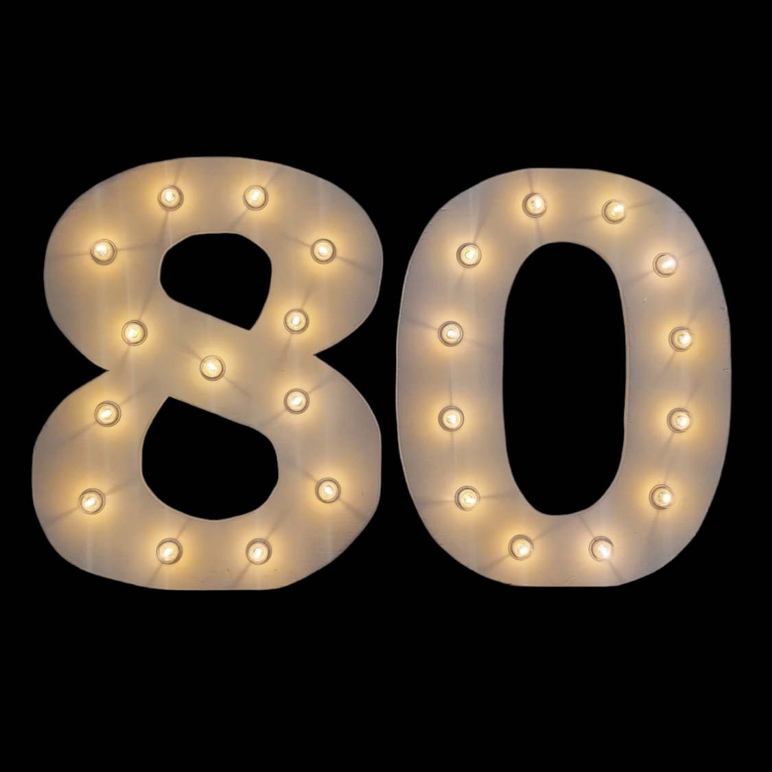 1m hoher Schriftzug "80"! Ein muss, an jeder Geburtstagsparty! Auch andere Zahlen möglich. 1,2,3,4,5,6,7,8,9,10,20,30,40,50,60,70,90,100,2022,2023,2024,2025 Die Zahlen werden inkl. einer warm-weissen LED Beleuchtung geliefert. Falls Sie lieber farbige Lämpchen möchten, dann nehmen Sie 25 Stück 96719