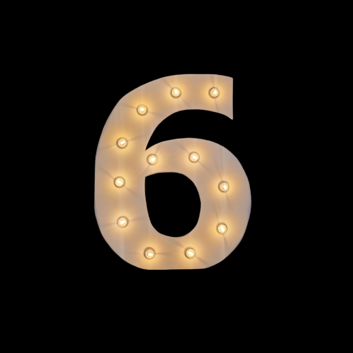 1m hoher Schriftzug "6"! Ein muss, an jeder Geburtstagsparty! Auch andere Zahlen möglich. 1,2,3,4,5,7,8,9,10,20,30,40,50,60,70,80,90,100,2022,2023,2024,2025 Die Zahlen werden inkl. einer warm-weissen LED Beleuchtung geliefert. Falls Sie lieber farbige Lämpchen möchten, dann nehmen Sie noch folgende Artikel Nummer dazu: 12 Stück 96719