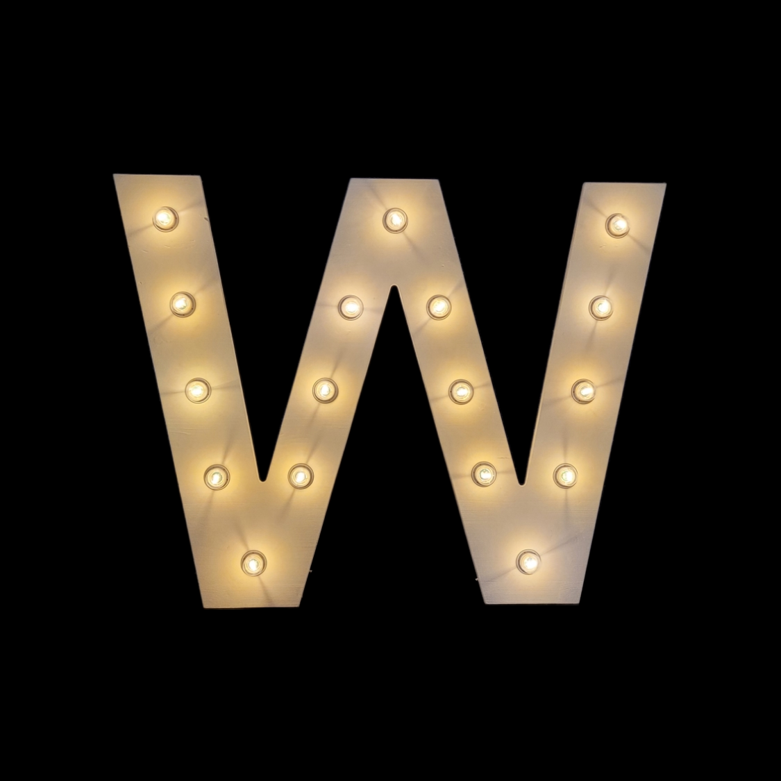 1m hoher Schriftzug "W"! Ein muss, an jeder Party. Die Buchstaben werden inkl. einer warm-weissen LED Beleuchtung geliefert. Falls Sie lieber farbige Lämpchen möchten, dann nehmen Sie noch folgende Artikel Nummer dazu: 17 Stück 96719
