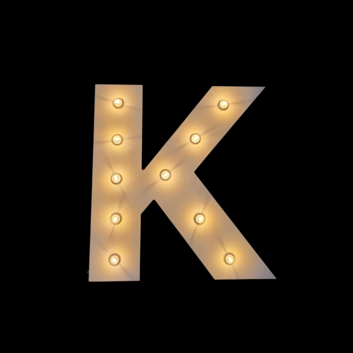 1m hoher Schriftzug "K"! Ein muss, an jeder Party. Die Buchstaben werden inkl. einer warm-weissen LED Beleuchtung geliefert. Falls Sie lieber farbige Lämpchen möchten, dann nehmen Sie noch folgende Artikel Nummer dazu: 10 Stück 96719