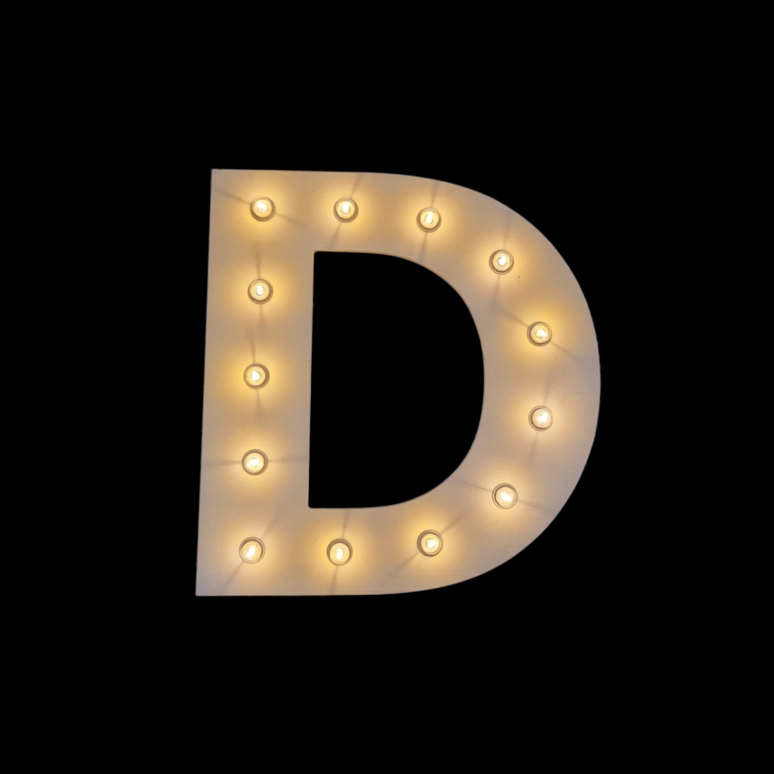 1m hoher Schriftzug "D"! Ein muss, an jeder Party. Die Buchstaben werden inkl. einer warm-weissen LED Beleuchtung geliefert. Falls Sie lieber farbige Lämpchen möchten, dann nehmen Sie noch folgende Artikel Nummer dazu: 13 Stück 96719