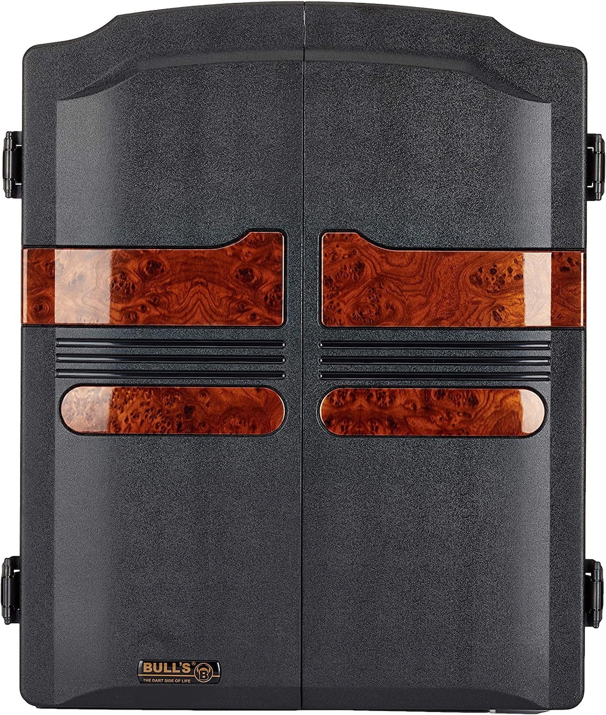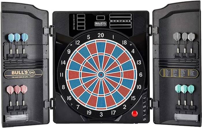 Auch die Geräte Sounds sind neu und bringen mehr Spass und Originalität beim Spiel. Neun modernen LED Anzeigen zeigen für 4 Spieler den Game Status, jetzt über dem Dart Board an. Hochwertiges Dartboard im Kabinett für den fortgeschrittenen Spieler, original Turnier Grösse mit Zweiloch Segmenten und original Turnier Grösse beim Bulls Eye, für 1-8 Spieler / 2-4 Teams mit automatischer Punktewertung, Dart-Finish Funktion, zählender Fangring für verpasste Darts, Abprall Wertung, regulierbarer Sound, Double-In/Double-Out Funktion, Tastensperre und Cyber-Match Funktion bis Level 5. 38 Spiele mit 323 Variationen. Zubehör: 12 Darts, 40 Soft Tips, Netzteil und mehrsprachige Bedienungsanleitung. Masse geschlossen: ca. 58 x 51 cm, geöffnet: 58 x 100 cm.