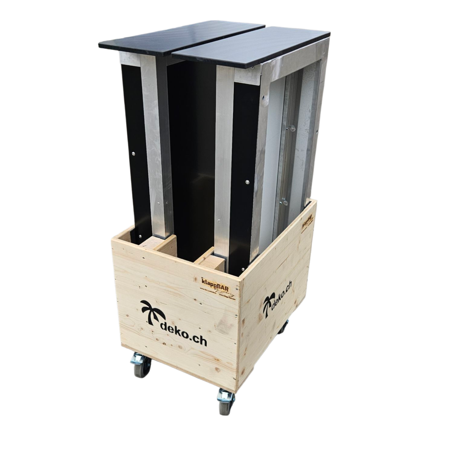 Abschlussecke 14.5x60x118 cm für Klappbar mit Aluminiumgestell und Wendeplatte. Die Bar kann schwarz oder weiss an der Vorderseite sein. Aus einem Stück. Mit Verbindungsschrauben können die Barelemente und Ecken zusammengefügt werden. Qualitätsprodukt