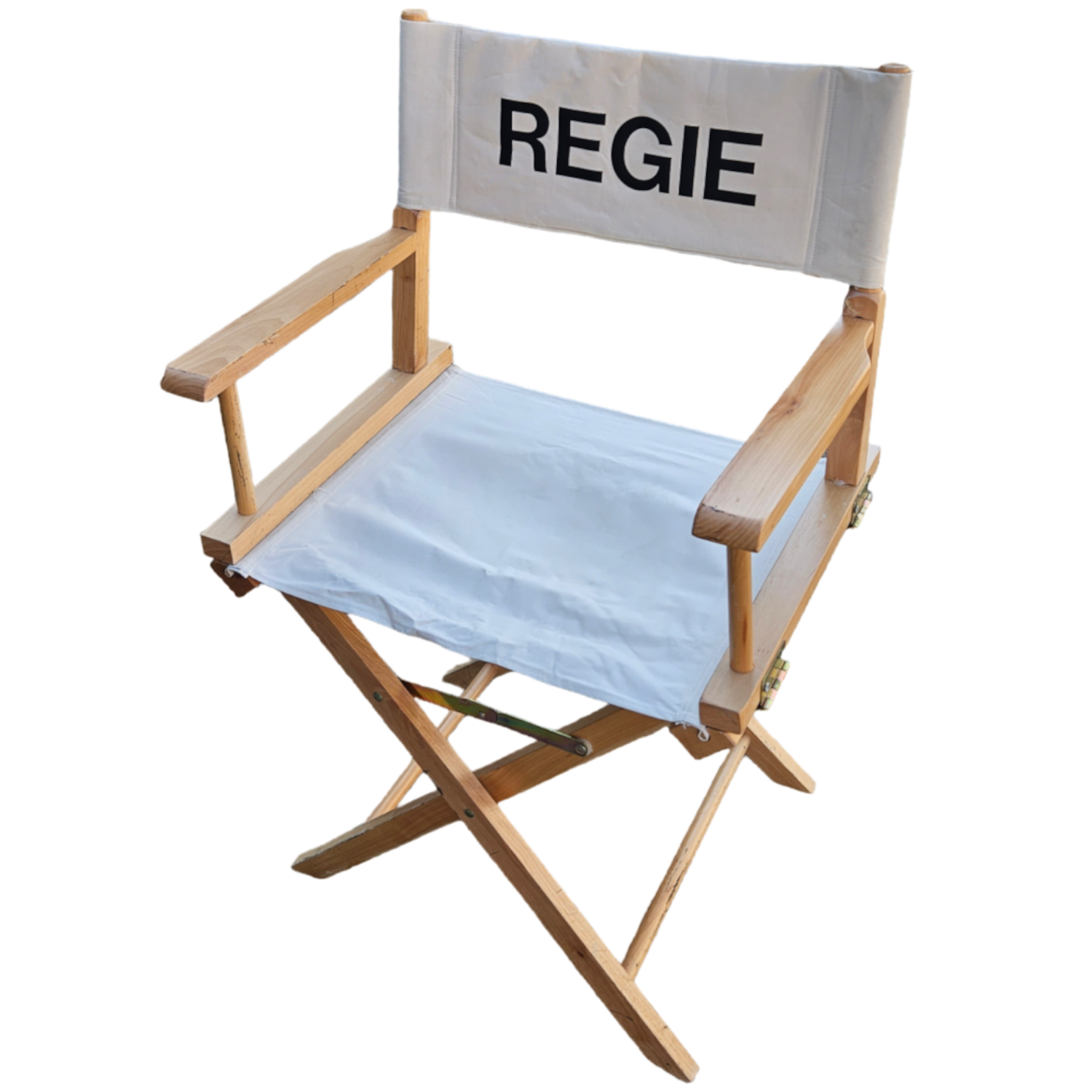 Weisser Regiestuhl mit schwarzer REGIE Beschriftung.