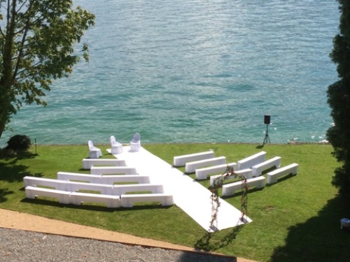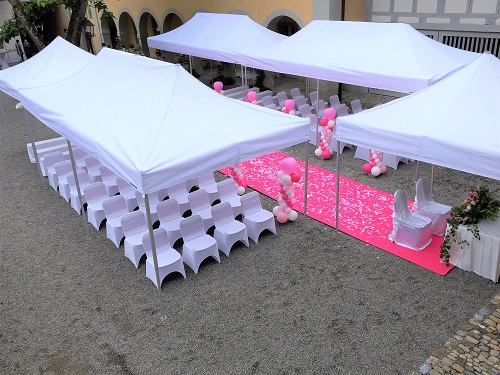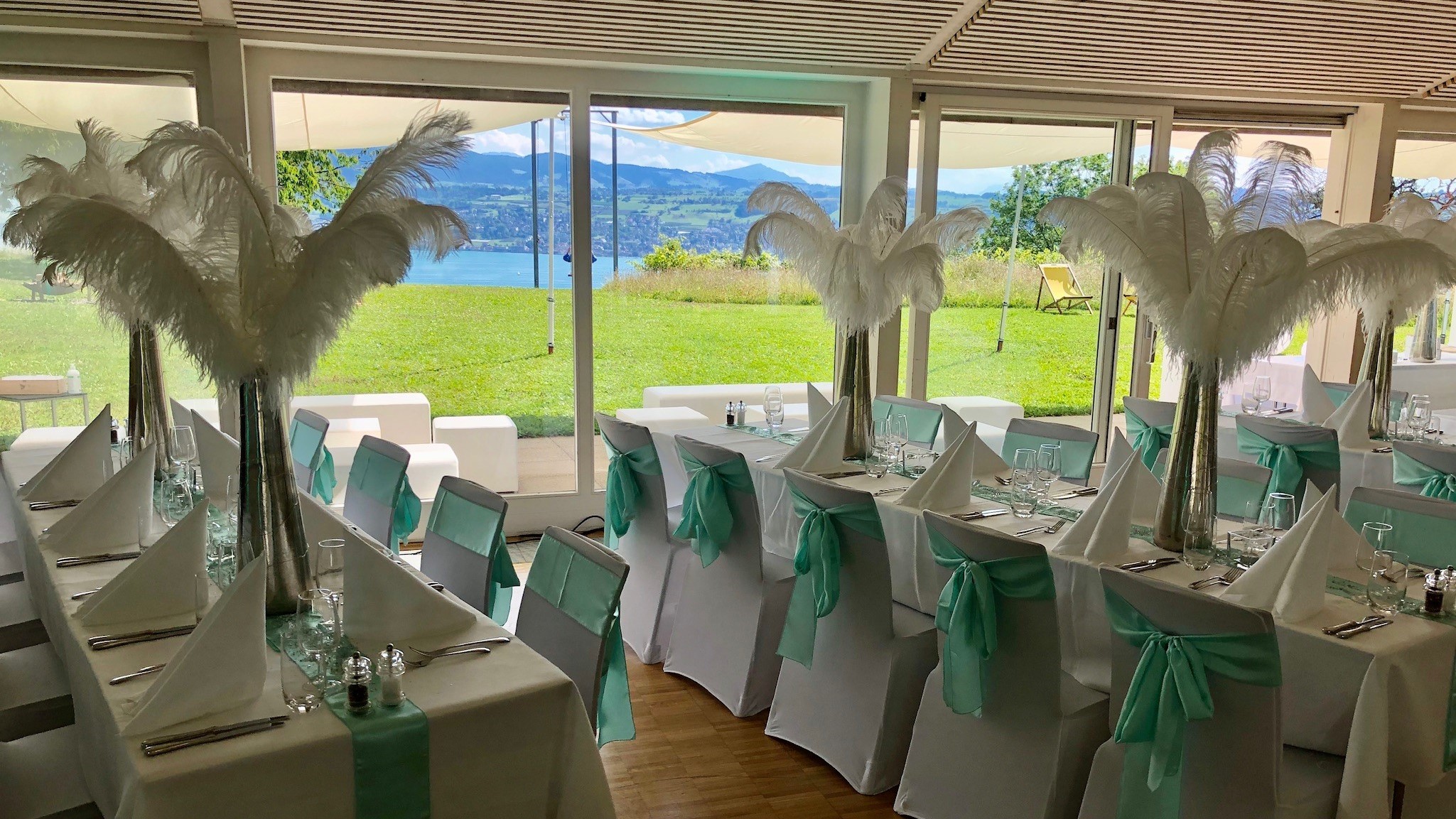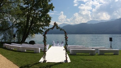 Traumhochzeit im Park Hotel Weggis, mit Hussen, Rosenbogen, Teppich und Soundanlage