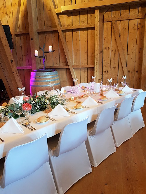 Hochzeitsdekoration mit Stretch Stehtischhussen und Organzaschleifen