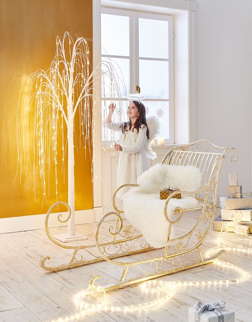 Schöner Schlitten, ideal für Ihre Advents- und Weihnachtsdekoration. Der Schlitten ist aus Metall gefertigt und bis 90 kg belastbar. Farbe: weiss mit goldenen Akzenten. Masse: ca. L150 x B61 x H93 cm, Sitzfläche ca. B45 x T55 cm, Sitzhöhe ca. 45 cm.