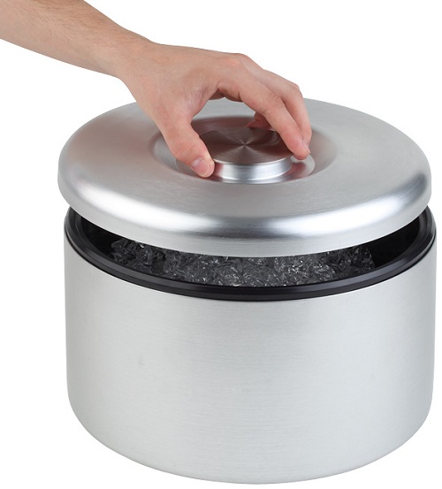 Eisbehälter silber mit Deckel aus Aluminium für die Aufbewahrung von Crush Eis oder Eiswürfeln.