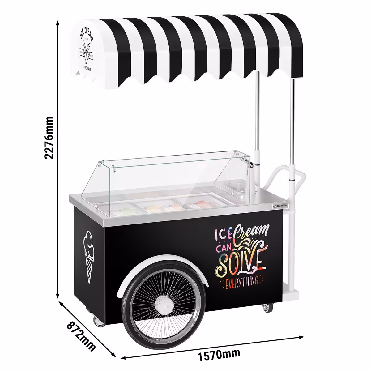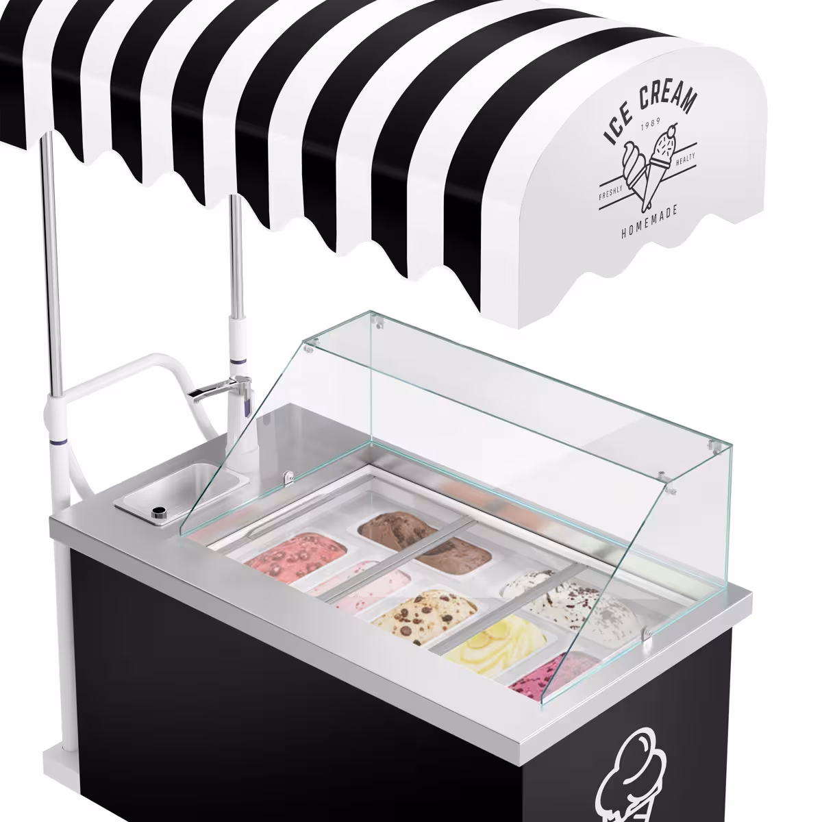 Mit diesem stilvollen Eiswagen bringst du Genuss und Atmosphäre direkt zu deinen Gästen. Das elegante Design mit schwarz-weisser Markise sorgt für einen echten Blickfang und verleiht jedem Anlass einen Hauch von Street-Food-Charme ✨