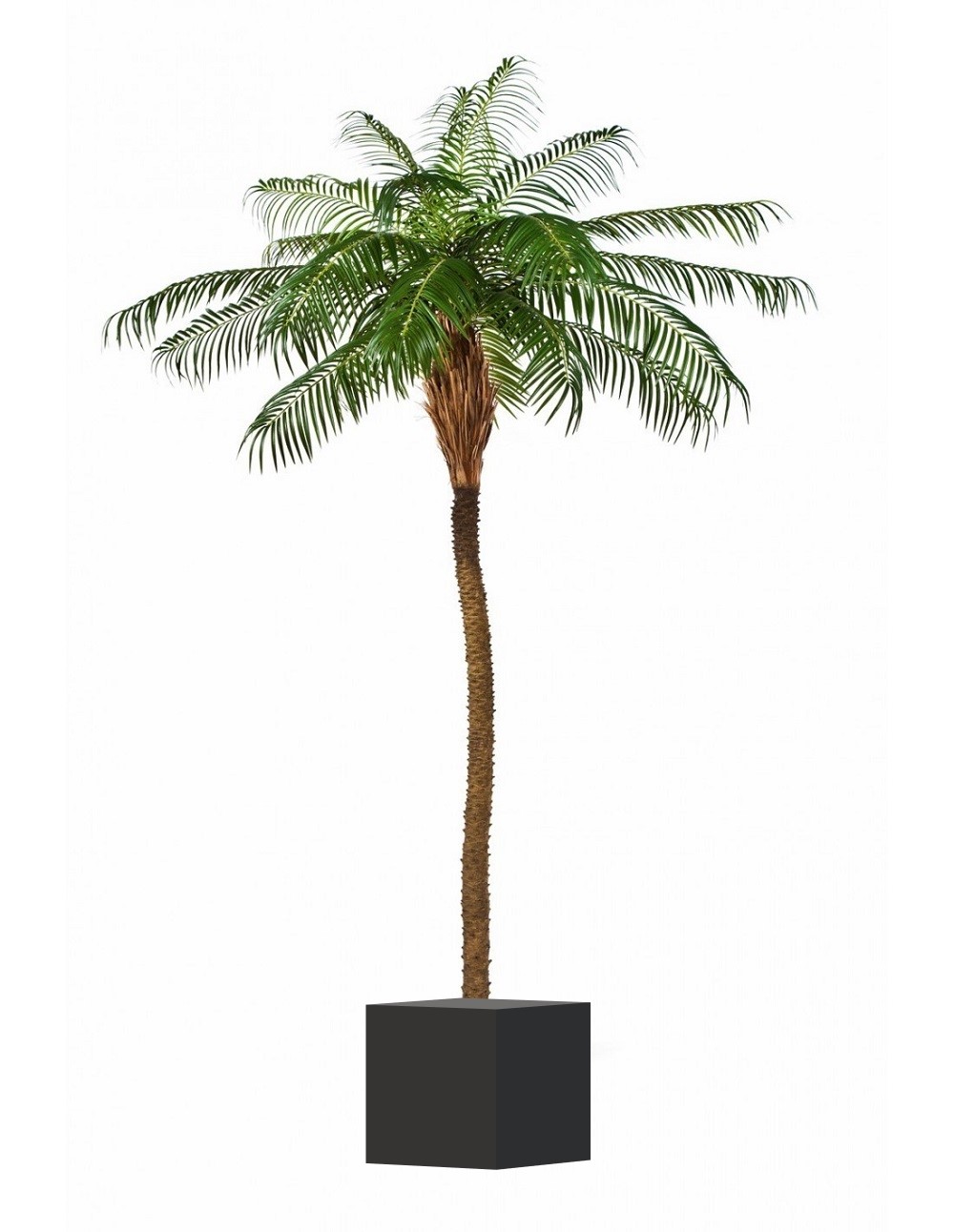 Phönixpalme mit Echtstamm und Textilblättern. Auch für den Aussenbereich geeignet. Sieht täuschend echt aus. Naturgetreue Verarbeitung. Lieferung mit grossen 40 kg schwerem schönem anthrazit farbigen Topf. Beim Kaufartikel ist der Topf nicht im Preis inklusive.