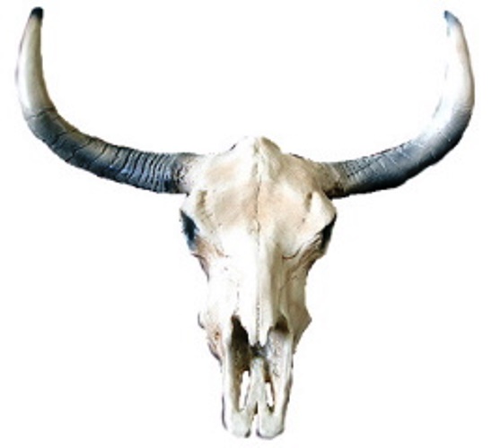 Originalgetreu nachgemachter Rinderschädel aus Polyester. Masse: B70 x T45 x H75 cm.
